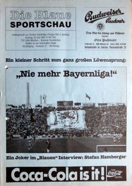 1991/92 Nr. 19, 69. Jg. 1860 - Bayern München Freundschaftsspiel DIN A4 - 8 Seiten