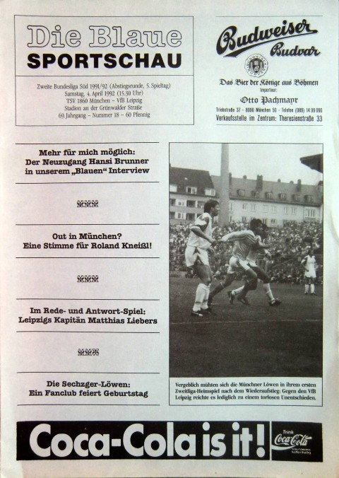 1991/92 Nr. 18, 69. Jg. 1860 - VfB Leibzig 0:2 Abstiegsrunde DIN A4 - 8 Seiten