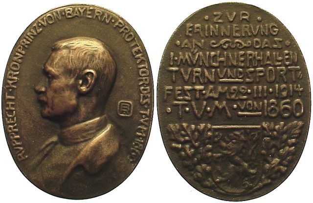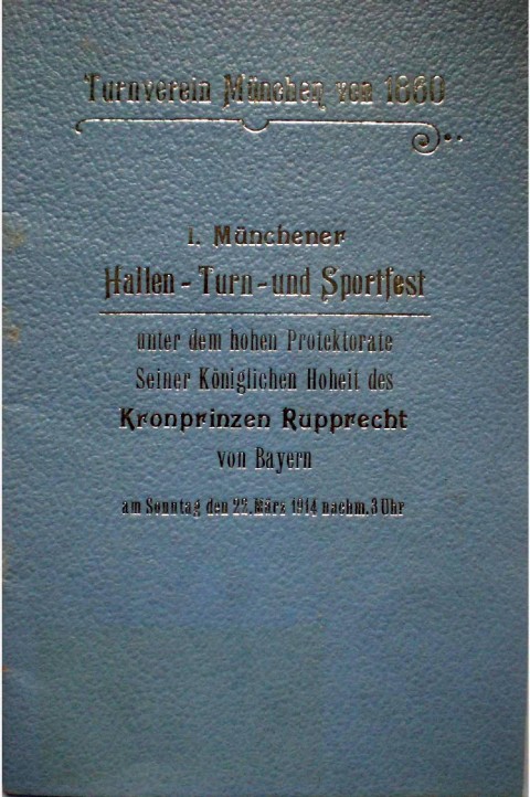 Turnverein München von 1860 1. Münchener Hallen- Turn. und Sportfest unter dem hohen Protektorate Seiner Königlichen Hoheit des Kronprinzen Rupprecht von Bayern am Sonntag den 22. März 1914 nachm. 3 Uhr 15 Seiten - DIN A 5 - mit Programm, Original Eintrittskarte, Medaille und Pokal (1. Preis Olymp. Militär-Stafette)