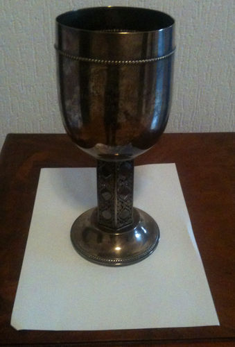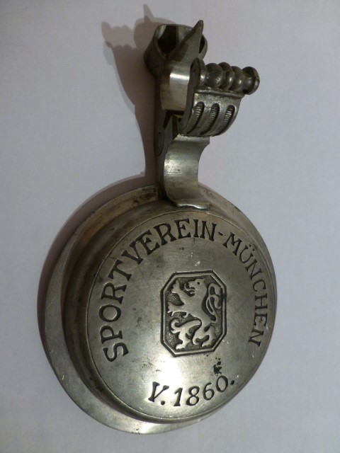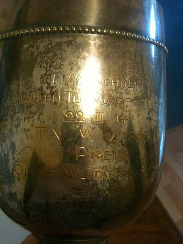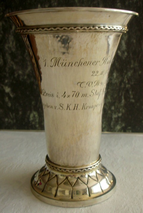 Siegerpokal - 1. Münchener Hallen- und Sportfest - 22.03.1914 T.V.M. v. 1860 1. Preis i. 4x70 m Staf-Öaufen f- Offiziere Gegeben v. S.K.H. Kronprinz Rupprecht v. Bayern Höhe = 15.5 cm, Durchmesser oben = 11 cm Stempel: Halbmond Kronr.-800 fehlt mir leider