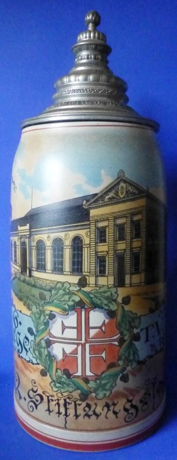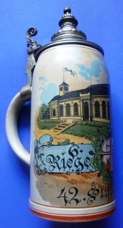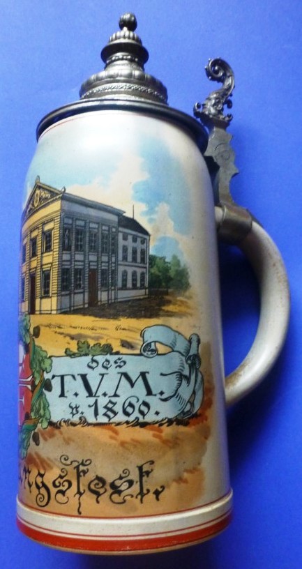 Krug 2 l 1902 - 42. Stiftungsfest T.V.M. v. 1860 - 6 Riege abgebildet ist die alte Turnhalle