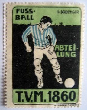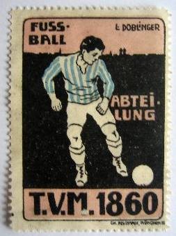 vor 1914 - 3 Alte Künstler-Reklamemarken/Vignetten Fussballabteilung T.V.M. 1860 in blau / rot / grün, 3.9 x 5.3 cm