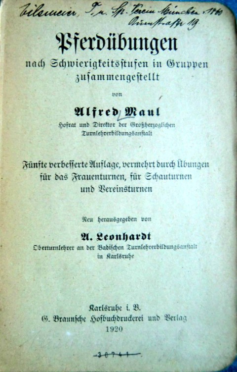 1920 - Buch 151 Seiten - Pferdeübungen mit Notit Vilsmeier vom T.u.Sp. Verein v. 1860