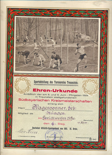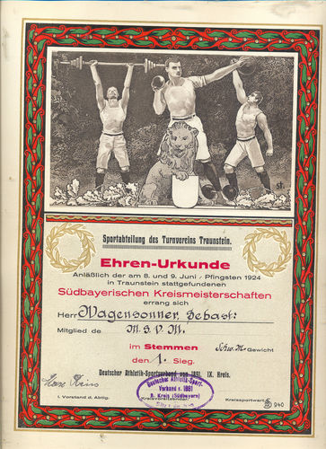 1924 - Ehren Urkunde Südbayerische Kreismeisterschaften Gewichtheben u. Ringen Sebastian Wagensonner I. Platz im Stemmen