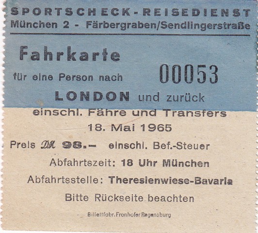 1965 Zugkarte nach London zum Spiel West Ham - 1860 München
