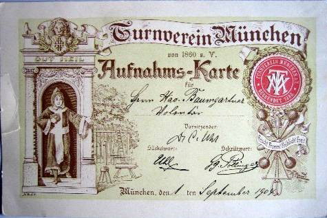 1921 - Urkunde Turn- u. Sport Verein München von 1860 Bei den Jugend-Vereinskämpfen 1921 erang Josef Sänger den 3. Preis im Hochspr. Die Jugendabteilung